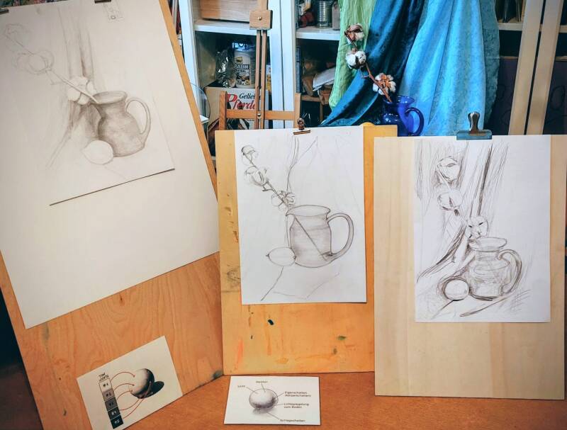 Wir arbeiten mit den Grundlagen der bildenden Kunst: Licht und Schatten, Proportionen, Perspektive, Schraffur sowie Farbtheorie und Koloristik. Ein besonderer Schwerpunkt liegt auf Komposition und bewusstem Bildaufbau.