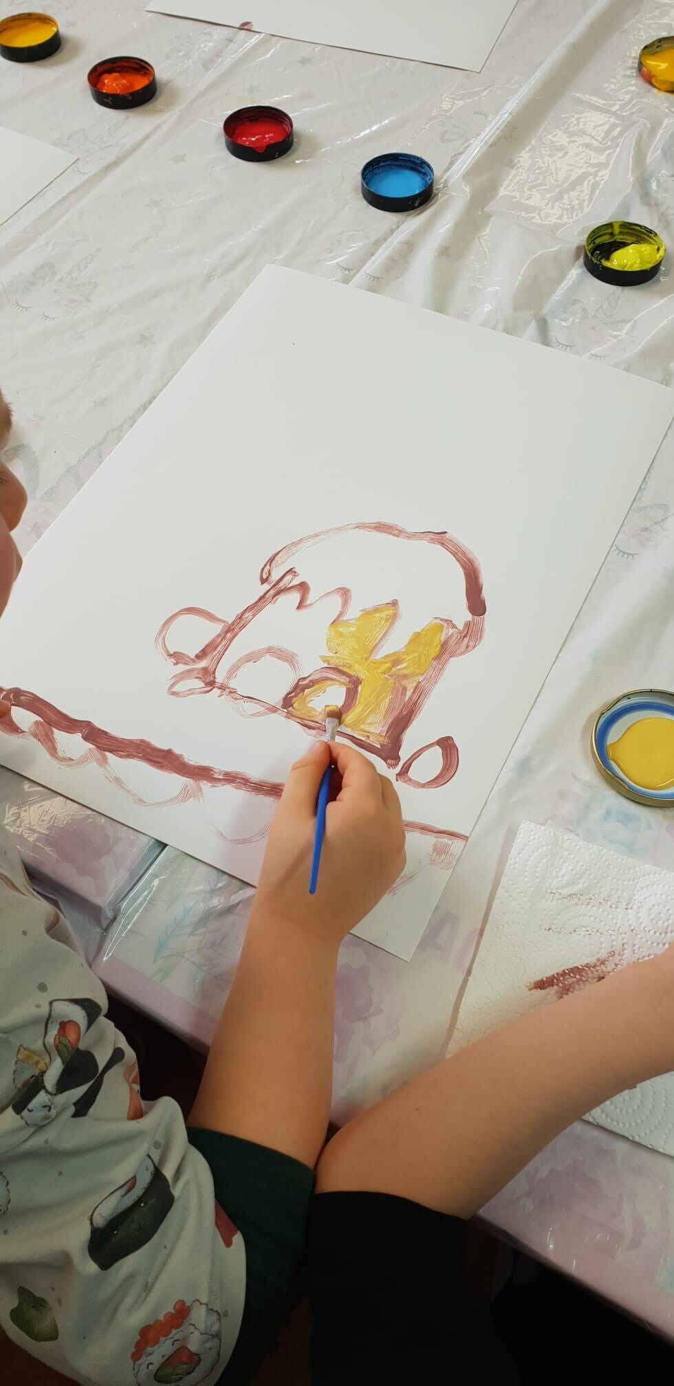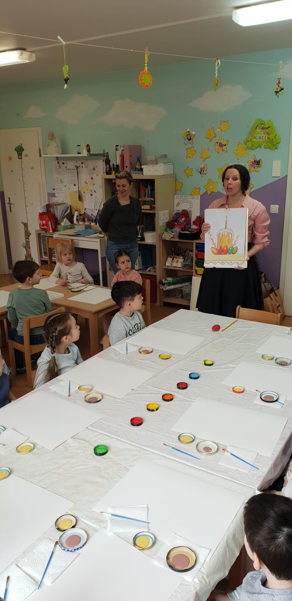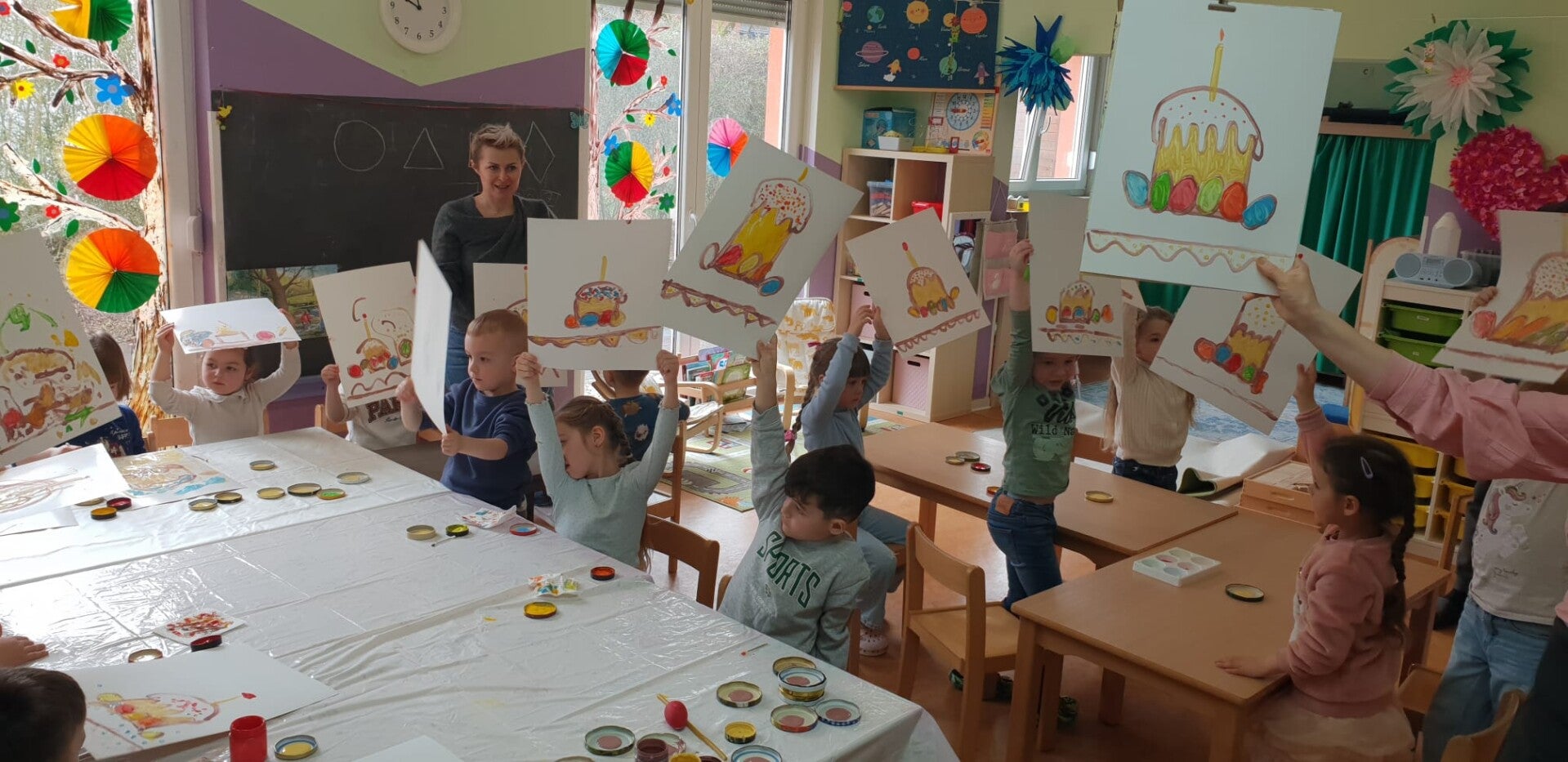 Die Kinder malten mit viel Freude traditionelle Osterkuchen (Osterbrot) mit bunten Eiern und Kerzen. Der Workshop war lustig, spannend und kreativ, und alle Teilnehmer – Kinder wie Eltern – waren rundum zufrieden.